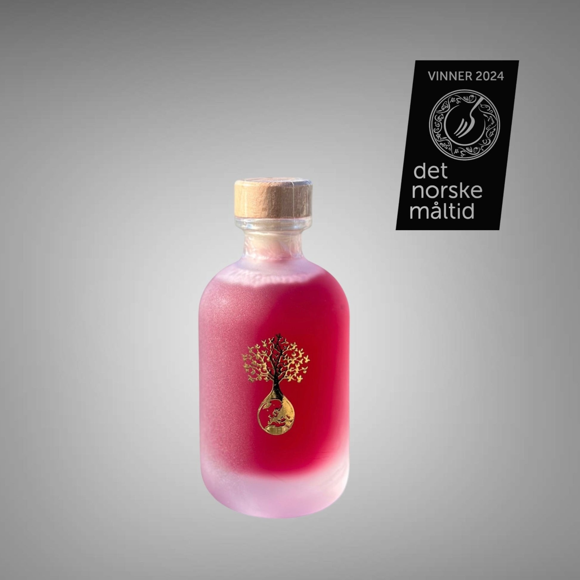 Flasken er i frostet glass med trekork og har en vakker lilla farge. Flasken kan, når den er tom, gjenbrukes til "alt". Et veldig hyggelig alternativ som en vertinne gave eller om du ønsker noe spesielt selv. Er du en restaurant som ønsker noe vilt og vakkert med en spesiell smak, ta gjerne kontakt med oss!